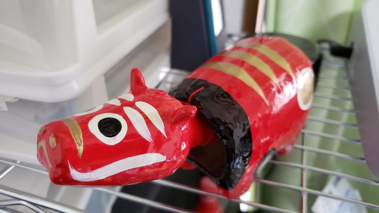 福島県西部・会津地方の伝統的な玩具(張り子人形)であり、 柳津町の圓藏寺(福満虚空蔵尊)の建立の際に材木を運搬したといわれる赤い牛を模しています。